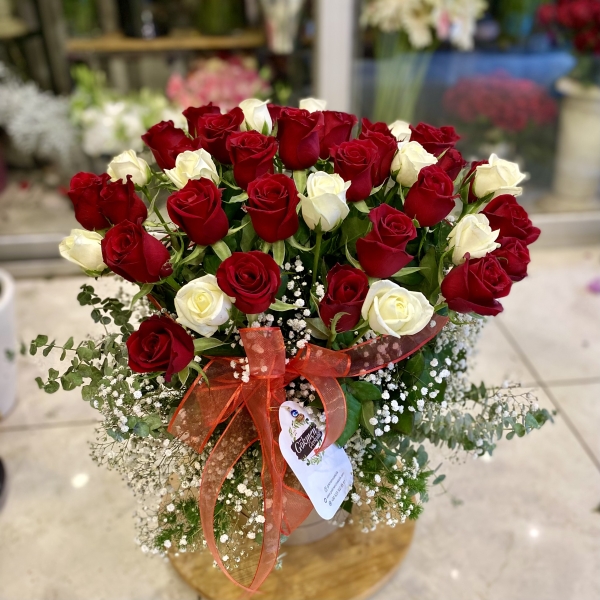Ürün Kodu: GC21725 Adet Uzun Kırmızı Gül, 15 Adet Uzun Beyaz Gülden Oluşan Kutu Aranjmanımız