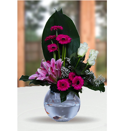 Ürün Kodu: GC61Cam fanus içerisinde çakıl taşları ve 1 adet japon balığı üzerinde 4 adet beyaz gül, 8 adet fuşya mini gerbera, 3 kandil pembe kazablanka, yeşillik ve cipsolardan oluşan fuşya, balıklı aranjman.