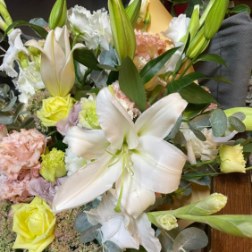 Ürün Kodu: GC1892 Dal Beyaz Kazablanka, 5 Dal Beyaz Glayöl, 6 Dal Beyaz ve Somon Rengi Lisyantus, Sarı ve Mor Gül Buketi