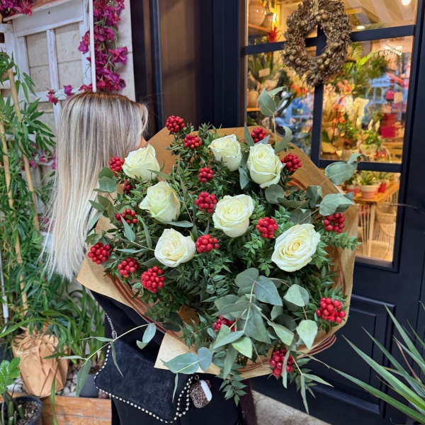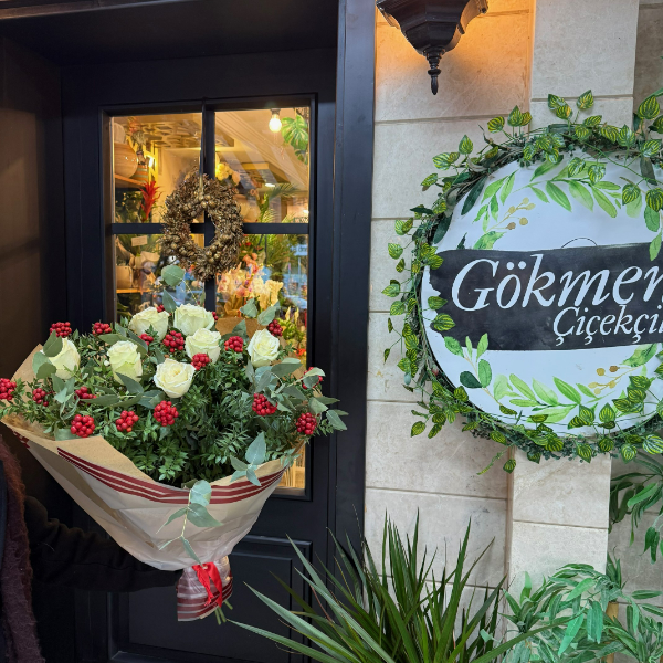 Ürün Kodu: GC2283 kokina demeti ve 7 adet beyaz güllerden oluşturduğumuz yılbaşı konseptli buketimiz